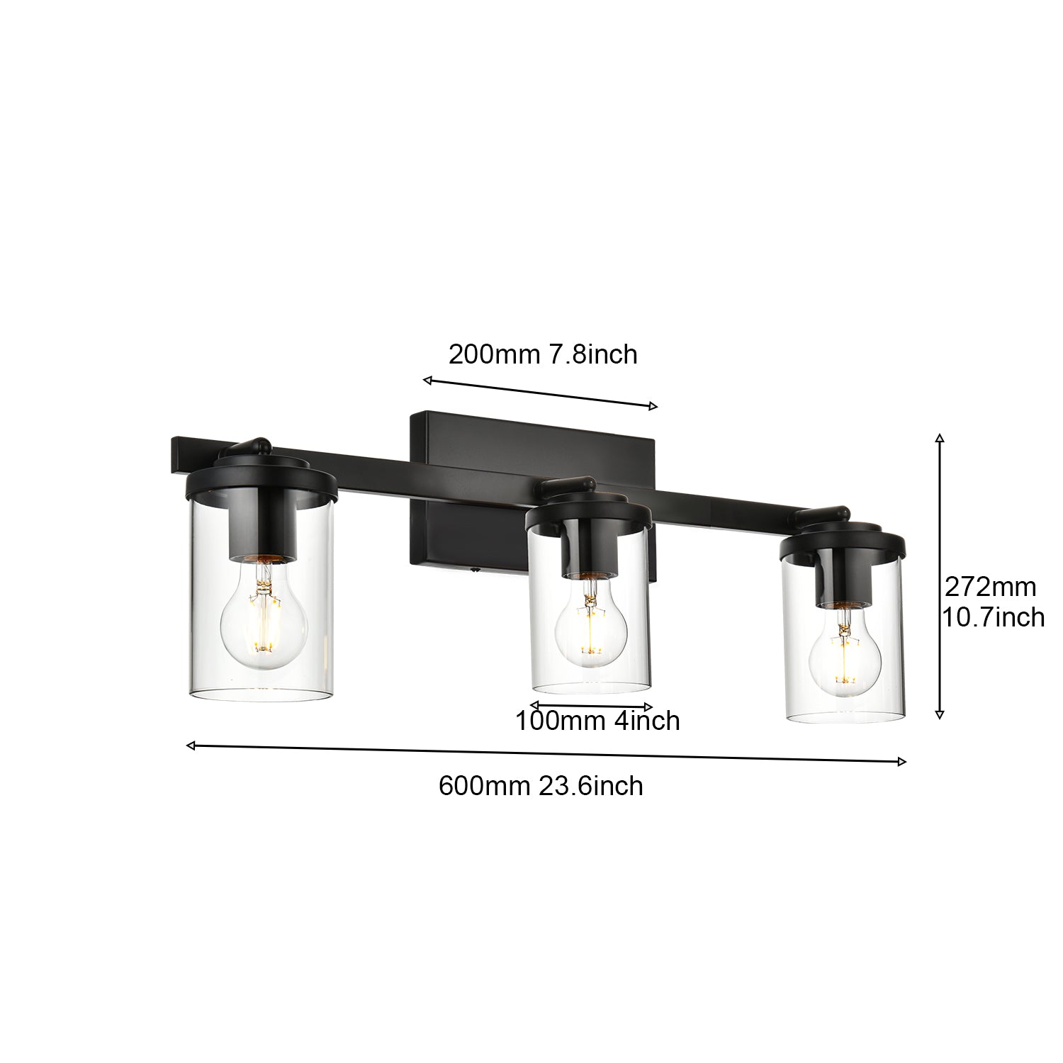 Black Adjustable Track Light Fixture – Modern 3-light Clear Glass Shade Vanity Track Lights with Flexible Heads Wall Mounted