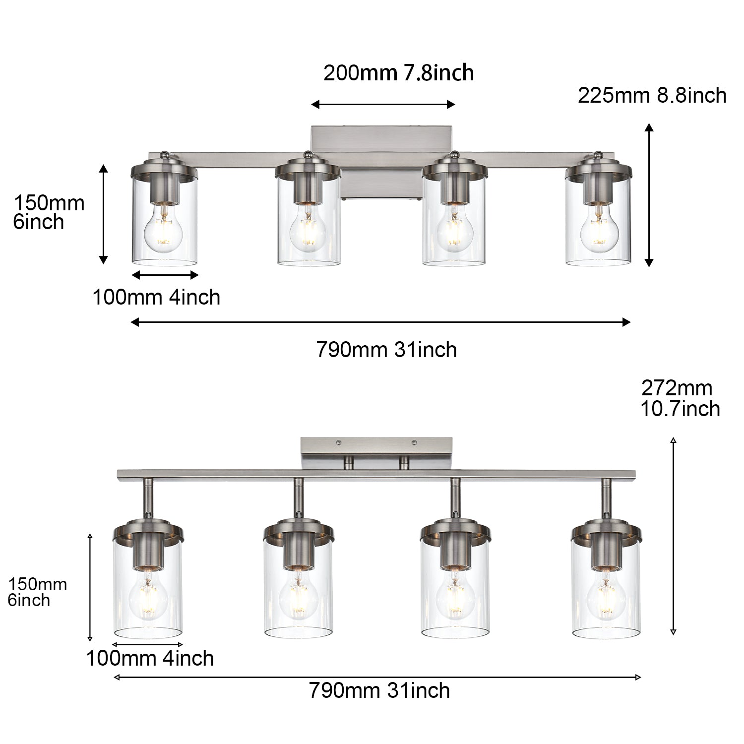 Brushed Nickel Adjustable Track Light Fixture – Modern 4-light Clear Glass Shade Vanity Track Lights with Flexible Heads Wall Mounted