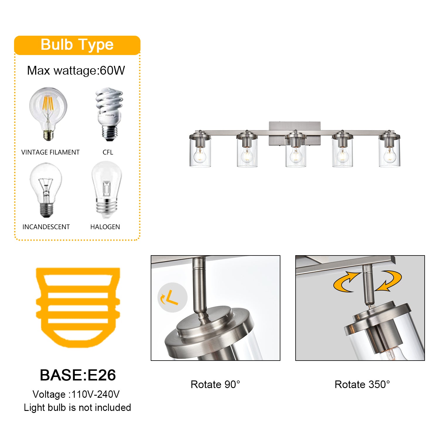 Brushed Nickel Adjustable Track Light Fixture – Modern 5-light Clear Glass Shade Vanity Track Lights with Flexible Heads Wall Mounted